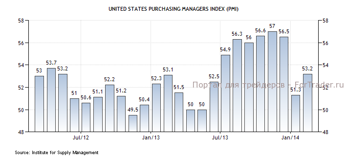 Личные доходы потребителей США выросли в январе на 0,3% по сравнению с предыдущим месяцем, превысив ожидания роста на 0,2%, в то время как личные расходы укрепились на 0,4% м/м, что оказалось больше прогноза +0,1%. Отчет подтверждает последние данные, указывающие на то, что американцы начинают преодолевать эффект суровой зимы. Индекс деловой активности в производственном секторе США от ISM в феврале вырос до 53,2 п. с 51,3 п. в январе, заметно превысив ожидания роста до 52 п.