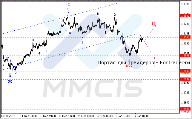 Коррекционная волна (4) старшего порядка завершилась формированием новой волновой группы младшего порядка. Таким образом, в качестве основного сценария на сегодня можно ожидать восстановления позиций пары в виде удлиненной фигуры «с» в область отметки 1,3200.