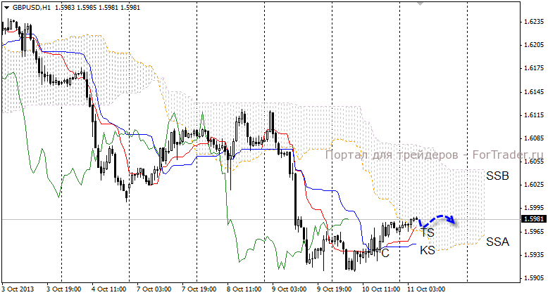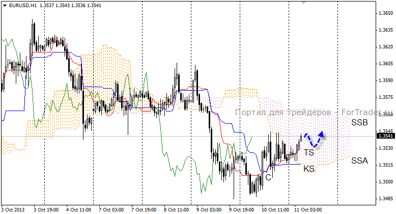 Евро/доллар, судя по всему, нашел вчера поддержку на фигуре 1.3500. Весь день валютная пара консолидировалась у данного уровня, после чего быки предприняли попытки к восстановлению рынка. Их стремления были поддержаны со стороны линий Тенкан и Киджун индикатора Ишимоку. Они сформировали бычий крест (С), который и сегодня будет функционировать в качестве сигнала к покупкам. Но при этом нельзя забывать о сопротивлении на уровне 1.3540.