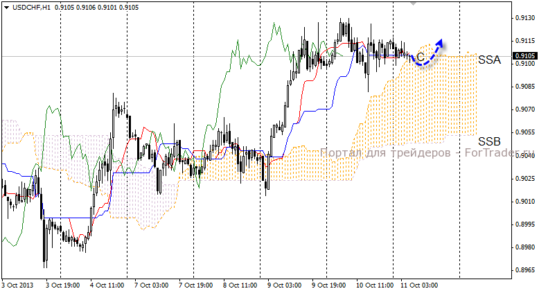 Доллар/франк консолидируется на достигнутых максимумах после взрывного роста днем ранее. Восстановление валютной пары остановилась на 0.9130. В ходе вчерашних торгов все линии индикатора настроились на боковое движение, что отлично подтвердило флэтовое состояние рынка. Сегодня цены вплотную подошли к верхней границе облака и Сенкоу Спан А будет сдерживать их от возможного коррекционного снижения. При формировании золотого креста линиями Тенкан и Киджун (С) у быков может появиться шанс.