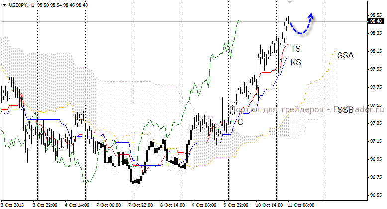 Доллар/йена вчера закрепилась над облаком Ишимоку, что послужило сигналом к новым покупкам валютной пары. Бычий интерес игроков был настолько велик, что сопротивление 97.80 они преодолели уже со второго раза. К концу дня были достигнуты целевые уровни роста – 98.00-98.15. Сегодня утром рынок отработал поддержку линии Тенкан и продолжил восстановление. На азиатской сессии был образован новый максимум 98.55, но все линии индикатора повернулись вбок. Это может означать начало консолидации.