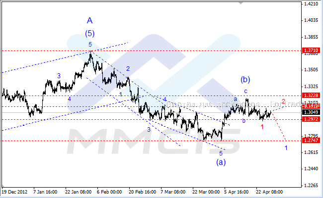 Исходя из этого, основным сценарием на ближайшие дни будет возобновление снижения котировок в направлении целевого уровня 1.2747, где и завершится волна «1». В качестве альтернативного сценария рассматривается вероятность того, что волна «1» уже завершена в районе 2-недельных минимумов, а в настоящий момент пара формирует волну «2» с вершиной на уровне 1.3112.