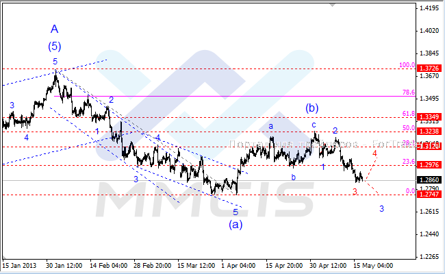 В приоритете по-прежнему остается дальнейшее развитие волны «3» и снижение котировок в направлении уровня 1.2747. В то же время нельзя исключать и альтернативного сценария, который предполагает завершение третьей волны в районе текущих минимумов и укрепление курса в район 30-й фигуры в рамках волны «4».