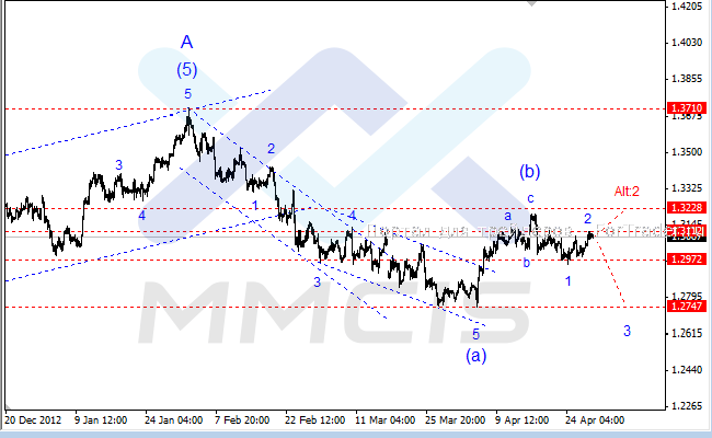 Таким образом, в качестве основного сценария дальнейшего развития событий можно ожидать возобновления снижения котировок в направлении целевого уровня 1.2747 в рамках волны «3». Альтернативный сценарий предполагает продолжение укрепления курса вплоть до уровня 1.3228 в виде усложненной структуры волны «Alt:2».