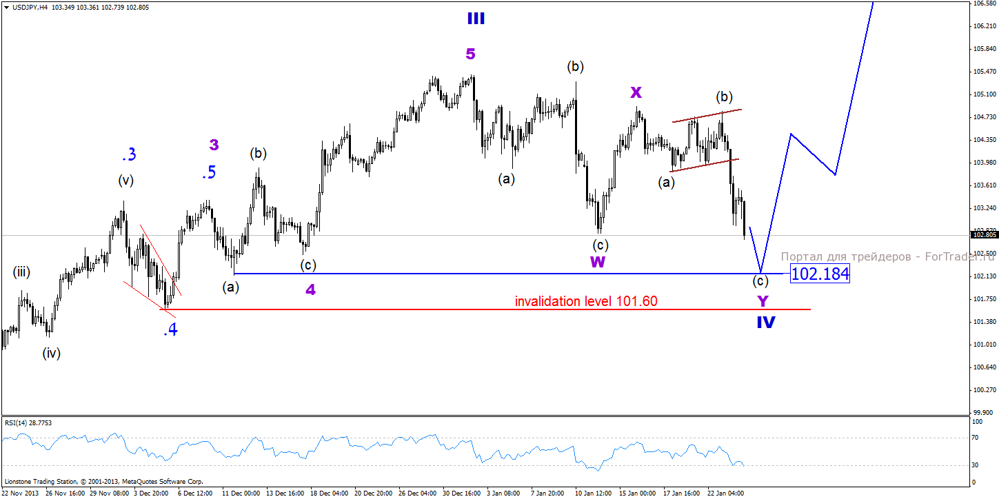 Пара достигла локального минимума на уровне 102.85, чем на время исключила возможность своего роста. Скорее всего на данный момент формируется коррекционная волна большего масштаба, чем ожидалось. Однако мощной поддержкой может послужить уровень 102.18, откуда ожидаем возобновления роста.