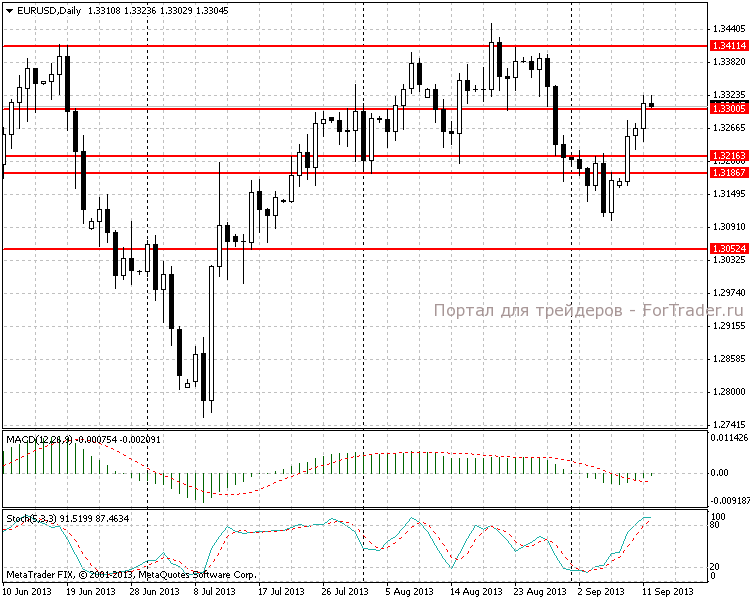 В результате валютных торгов за вчерашний день основная пара укрепилась еще на 50 пунктов, при этом был достигнут ключевой уровень сопротивления 1,3300, а дневная свеча закрылась на отметке 1,3310. Судя по дневному графику, у нас вновь наметилась восходящая тенденция, что подтверждает индикатор MACD, который пересек собственную сигнальную линию снизу-вверх и готовится подняться выше нуля. Стохастик добрался до уровня 90, что можно трактовать как некоторый перегрев рынка.