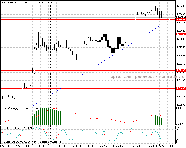 На часовом таймфрейме отчетливо распознается бычья тенденция. В данный момент цена подошла близко к линии тренда, при этом спустившись до 1,3300. В результате консолидации цены на азиатской сессии в диапазоне 1,3300-1,3320 MACD-гистограмма начала снижение, а быстрый стохастик достиг отметки 20.