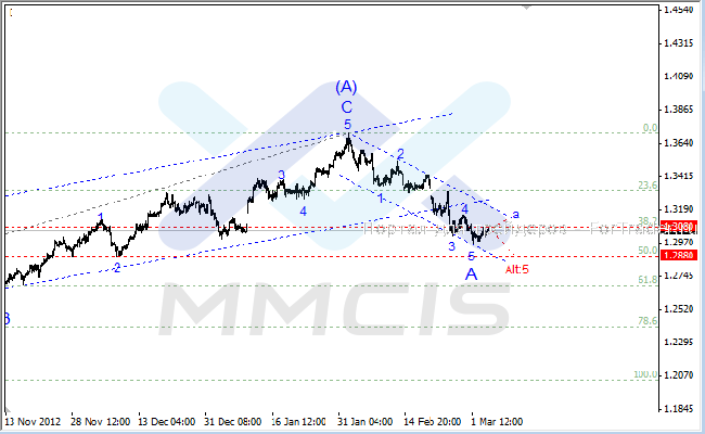 Поэтому в качестве основного сценария на сегодня аналитики рассматривают вероятность продолжения роста курса в направлении верхней границы нисходящего канала в виде волны «а». Однако для подтверждения данного сценария необходимо, чтобы произошел пробой сопротивления на уровне 1.3080. В качестве альтернативного развития событий можно ожидать возобновления снижения курса в виде волны «Alt:5» в направлении уровня 1.2880, который представляет собой 50% коррекции Фибоначчи.