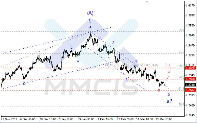 Поэтому основным сценарием на начало недели можно считать продолжение снижения курса к отметке 1.2687 в качестве пятой волны нисходящего импульса. В качестве альтернативного сценария рассматривается вариант, согласно которому нисходящий импульс завершен в районе текущих минимумов и в настоящий момент пара приступает к формированию коррекционной волны «а» в направлении 30-й фигуры.