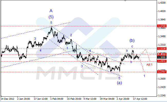 Поэтому основным сценарием на сегодня остается снижение курса единой валюты в направлении отметки 1.2972 в рамках волны «1» нисходящего импульса «(с)». В качестве альтернативного сценария рассматривается вероятность повторного тестирования парой 31-й фигуры с последующим разворотом вниз, в направлении целевого уровня 1.2972, в рамках усложненной структуры волны «Alt:1».