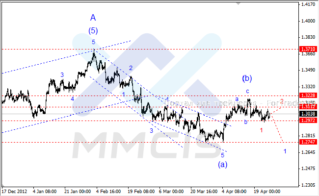 Поэтому основным сценарием на сегодня остается снижение котировок в рамках волны «1» нисходящего импульса «(с)». Сигналом к этому станет прорыв ключевой поддержки 1.2972. В качестве альтернативного сценария рассматривается завершение волны «1» в районе текущих минимумов и возобновление роста пары к отметке 1.3112 в виде коррекционной волны «2».