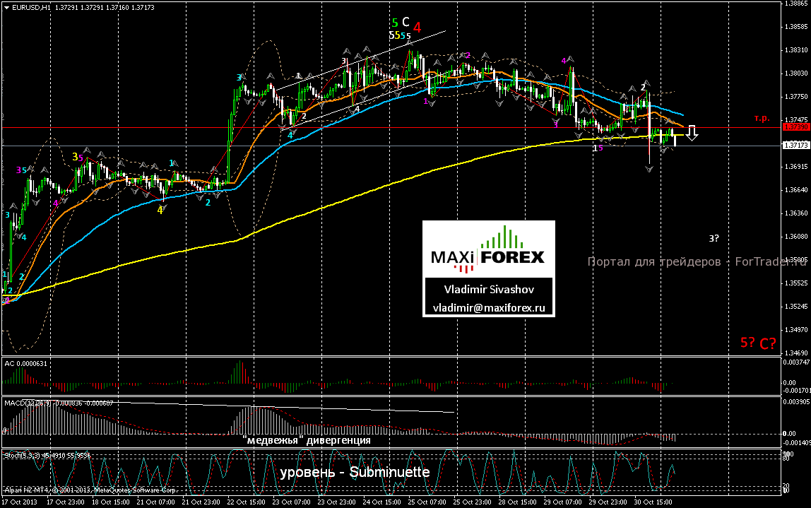 На торгах в среду, евро\доллар достиг недельного минимума, поскольку инвесторы продолжали сокращать позиции на покупку единой валюты — перед объявлением итогов двухдневного заседания Комитета по отрытому рынку ФРС США. Спекулятивные участники рынка накопили к этому моменту, довольно большое количество шортов в американской валюте, поэтому их желание зафиксировать прибыли по продажам и частично сократить риски, были вполне понятны. Тем не менее, публикация сильной статистики по снижению безработицы в Германии, остановила падение валюты и, вновь, развернула пару на подъём. До оглашения итогов заседания, «быкам» удалось откорректировать 50% предыдущих потерь и зафиксировать максимальный откат на отметке 1.3784. Однако последующие события резко изменили ценовую динамику пары. Комитет, в своём решении по ставкам, воздержался от внесения корректив в Объёмы финансового стимулирования и оставил норматив ставки по федеральным фондам на уровне – менее 0.25%. Голосование завершилось с результатом 9-1, а оценка экономической ситуации не претерпела, практически, никаких изменений. Подобное решение, полностью, соответствовало ожиданиям рынка, и было давно учтено в ценах евро\доллара. Поэтому, чётко сработал классический рыночный принцип «Покупай ожидания, продавай факты». Основными драйверами дальнейшего движения стали технические факторы — перекупленность единой валюты, волновая завершённость предыдущей восходящей коррекции, образование разворотных свечных моделей на вершине и формирующийся с 25 октября нисходящий тренд евро\доллара. Пара на этом фоне резко развернулась от достигнутого максимума и стремительно съехала вниз. В обвальном падении, евро протестировал минимальный уровень недели – 1.3696 и завершил день, незначительным откатом.