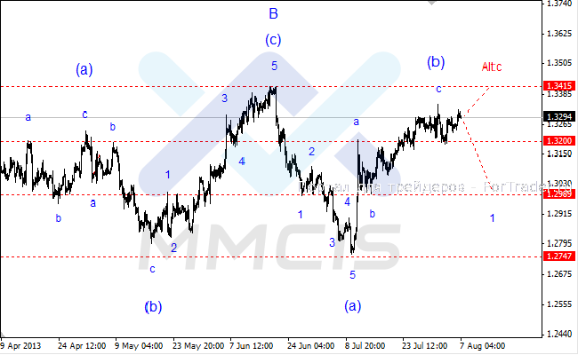 Тем не менее, в качестве основного сценария дальнейшего развития событий по-прежнему рассматривается вероятность развития снижения курса в рамках волны «1» нисходящего импульса «С» старшего порядка. Альтернативный сценарий предполагает временное укрепление курса к отметке 1.3415 в рамках усложненной структуры волны «Alt:c».
