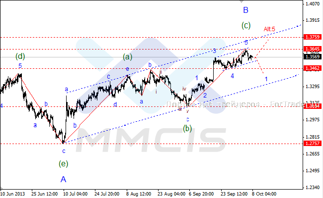 Тем не менее пока в приоритете остается «медвежий» сценарий, согласно которому пара формирует волну «1» нисходящего импульса старшего порядка. Подтверждением данного сценария станет тестирование поддержки на уровне 1.3462. В качестве альтернативного сценария аналитики рассматривают возможность продолжения роста котировок в виде усложненной структуры волны «Alt:5». Целевой отметкой для данного сценария станет уровень 1.3759, который представляет собой 100% расширения Фибоначчи.