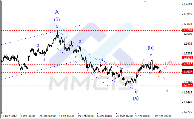 Таким образом, в качестве основного сценария на сегодня рассматривается прорыв локальной поддержки на уровне 1.2970 и снижение курса в область 1.2880—1.2910 в рамках волны «1» нисходящего импульса «(с)». Альтернативный сценарий предполагает завершение волны «1» в районе текущих минимумов и постепенное восстановление пары к отметке 1.3112 в рамках коррекционной волны «2».