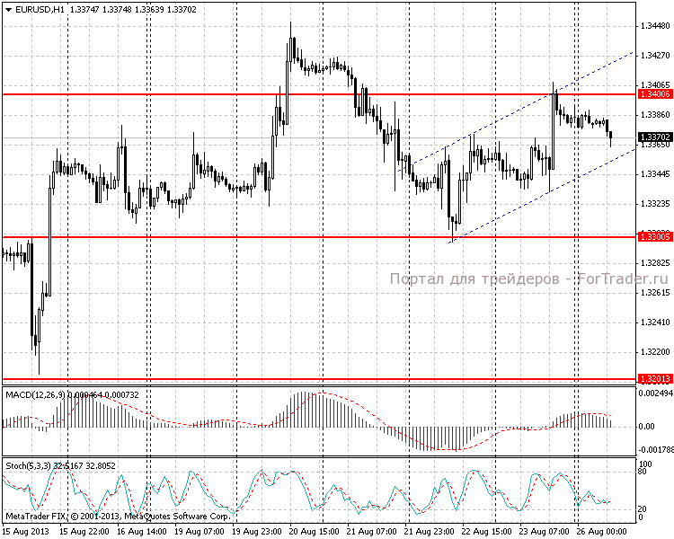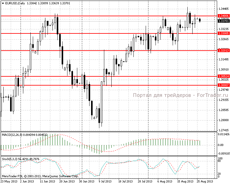 На европейской сессии в пятницу были опубликованы данные по ВВП Германии, на которые рынок отреагировал довольно слабо, поскольку они в целом совпали с ожиданиями (во втором квартале рост составил 0,7% в квартальном выражении и 0,9% в годовом). Движения начались уже на американской сессии. Слабая статистика по рынку жилья, а также высказывания представителя ФРС о необходимости продолжения программы стимулирования вызвали волну продаж американского доллара. Рост единой валюты оказался ограничен уровнем сопротивления 1,3400, после чего начался откат.