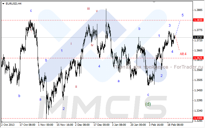 В этом случае дальнейшее укрепление пары будет рассматриваться в виде волны «5». Целевым уровнем для пятой волны выступает отметка 1.3830. Альтернативный сценарий по-прежнему учитывает возможность более глубокой коррекции в рамках удлиненной волны «Alt:4».