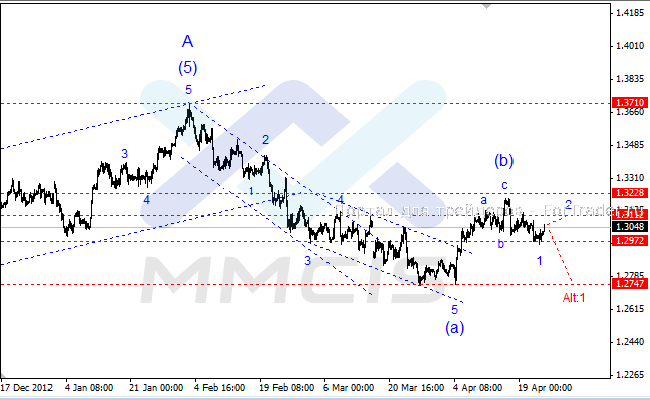 Поэтому в качестве основного сценария на сегодня можно рассматривать продолжение роста пары в направлении уровня 1.3112 в виде коррекционной волны «2». В то же время снижение курса к отметке 1.2972 и прорыв этого уровня отменят основной сценарий и станут сигналом к дальнейшему снижению котировок в виде усложненной структуры волны «Alt:1».