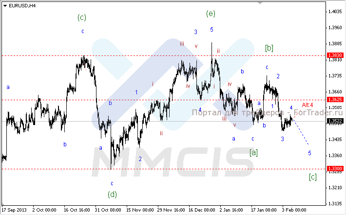 Пара евро/доллар продолжает консолидироваться вблизи 35-й фигуры. По мнению аналитиков, восходящая коррекция в рамках волны «4» подходит к концу, и уже в ближайшее время пара возобновит снижение в рамках волны «5» нисходящего импульса «[с]» старшего порядка.