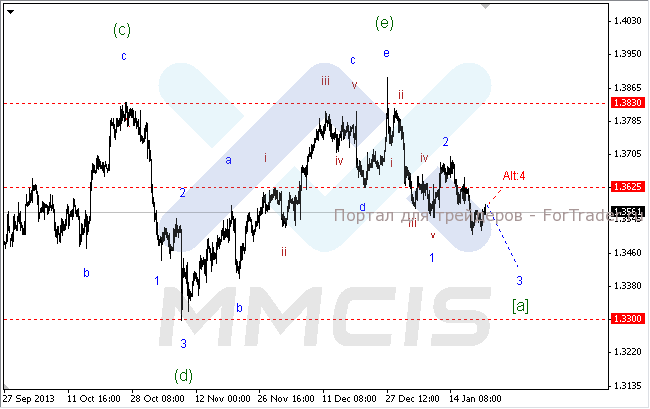Основной сценарий на ближайшие дни по-прежнему предполагает, что пара будет снижаться дальше, удлиняя волну «3», в рамках нисходящего импульса [а] старшего порядка. Согласно альтернативному сценарию, формирование третьей волны завершено, и в данный момент наблюдается укрепление пары в рамках коррекционной волны «Alt:4», целевым уровнем которой выступает отметка 1.3625.