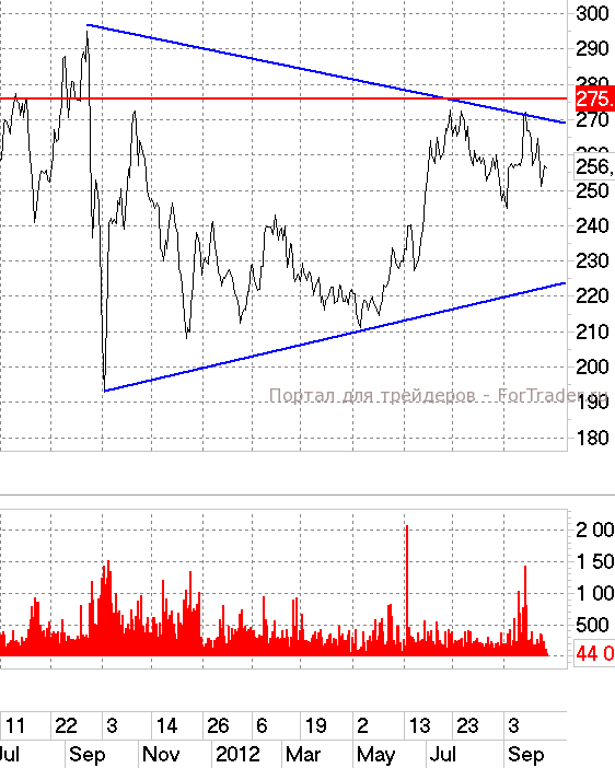 Уралкалий: техническая сторона демонстрирует нейтралитет инвесторов. Торговать в «долгую», согласно такой конфигурации, стоит только при пробое и четком закреплении выше отметок в 275 руб./акция. Сейчас же будет вполне ожидаемо ослабление курса до 220-230.