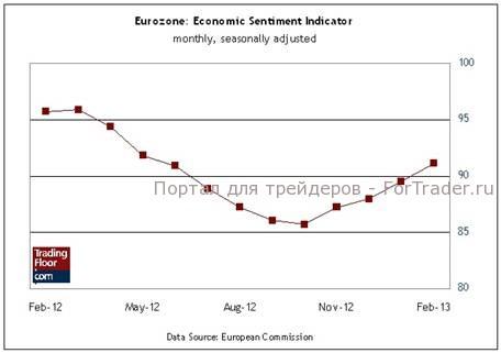 Как бы шокирующее это не звучало, но настроение в Европе в последние месяцы улучшалось. По крайней мере, об этом свидетельствует индекс экономических ожиданий Европейской комиссии. Посмотрим, удастся ли сохранить этот восходящий тренд в марте. Этот широкий индикатор настроения, объединяющий в себе показатели настроения в деловой и потребительской сферах, бросает вызов поступающим в последнее время новостям, которые указывают на возможное усугубление рецессии. Например, значение опубликованного на прошлой неделе индекса менеджеров по закупкам за март говорит нам о том, что спад в еврозоне усиливается.