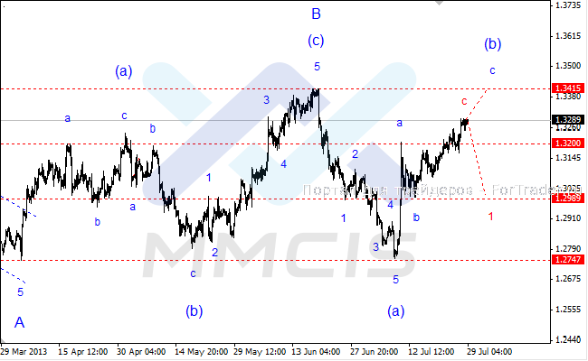 Поэтому в качестве основного сценария рассматривается вариант, согласно которому пара продолжит укрепляться в направлении уровня 1.3415 в рамках волны «с». Альтернативный сценарий предполагает завершение волны «с» на текущих максимумах и начало снижения котировок в виде волны «1» нисходящего импульса старшего порядка.