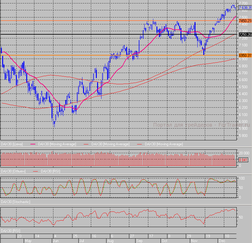Немецкий индекс DAX резко повалился на открытии – «гэп» вниз составил около 40 пунктов, после чего индикатор продолжил падать. В результате падение остановилось возле отметки 7600 пунктов. Если этот уровень не сдержит продажи, то следующими поддержками будут 7580 и 7570 пунктов.