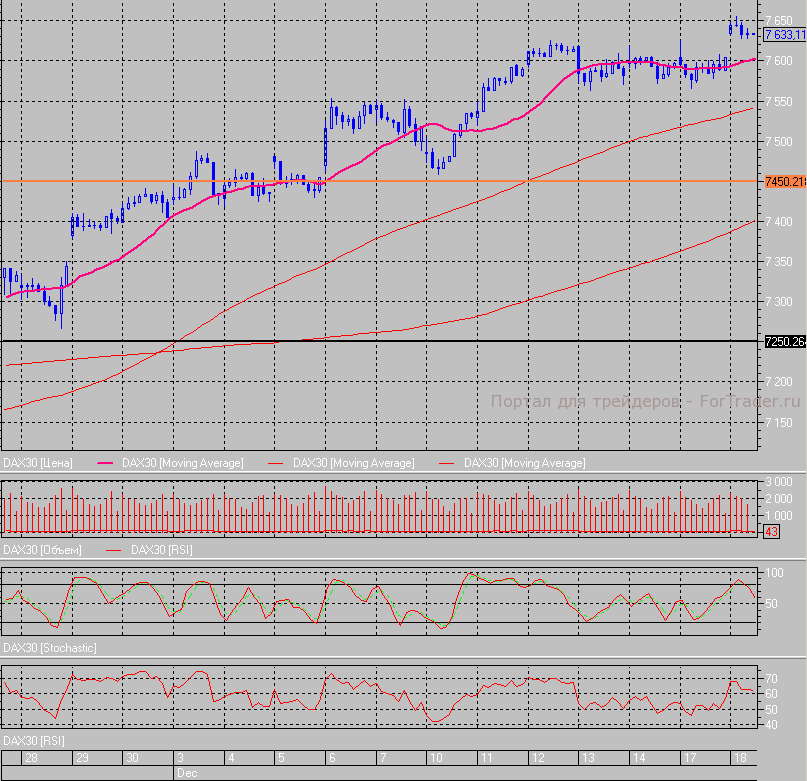 Довольно большой «гэп» вверх продемонстрировал утром немецкий индекс DAX и подскочил с 7605 до 7635 пунктов, а после этого достиг отметки 7650 пунктов. Тем не менее, удержать этот рубеж ему не удалось, после чего индикатор откатился до 7630. Вполне возможно, что утренний разрыв будет вскоре закрыт, и в этом случае поддержкой для DAX будут выступать уровни 7600 и 7580.
