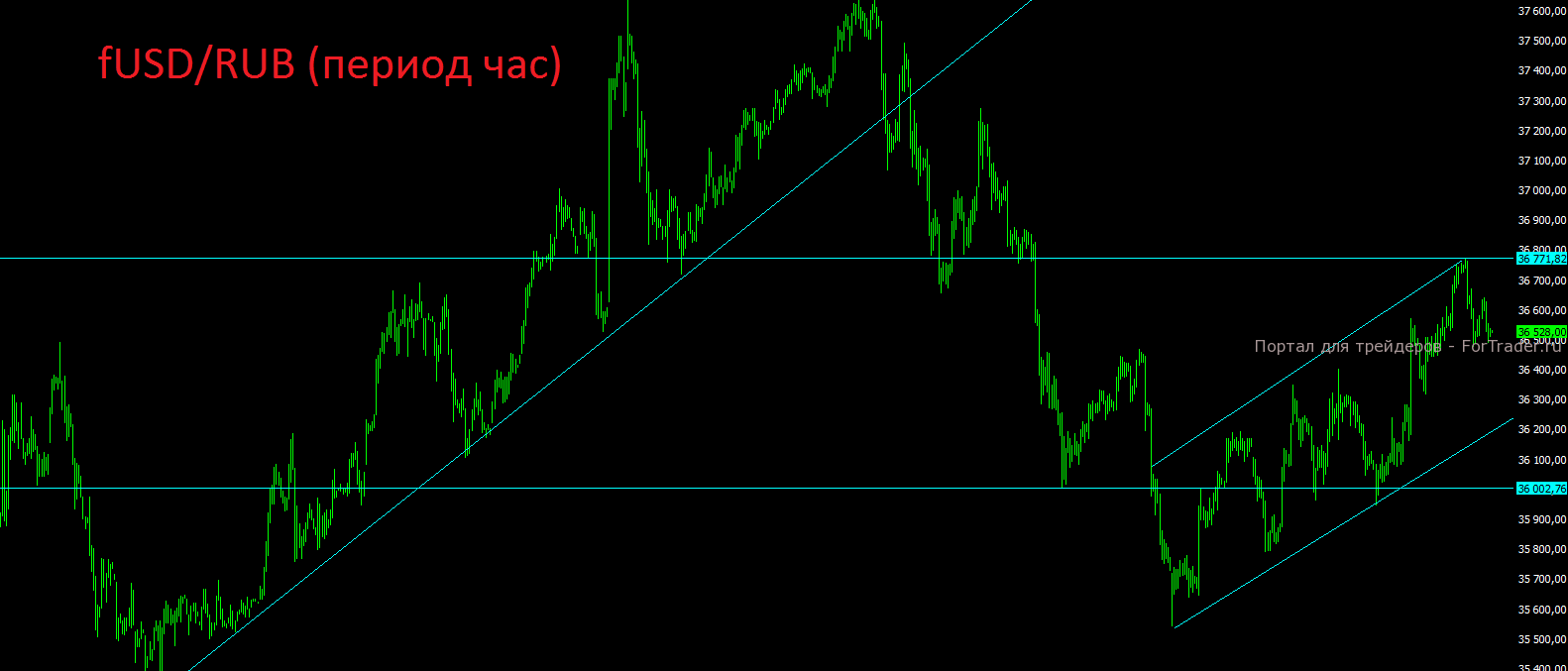 Фьючерс на валютную пару доллар-рубль продолжает находиться в восходящем локальном тренде и в среду довольно технично цена оттолкнулась от его верхней границы, где ещё проходит горизонтальное сопротивление. В случае, если цене удастся закрепиться выше отметки 36850, то стоит готовится к обновлению годовых максимумов по фьючерсу и соответственно годовых минимум по рублю.