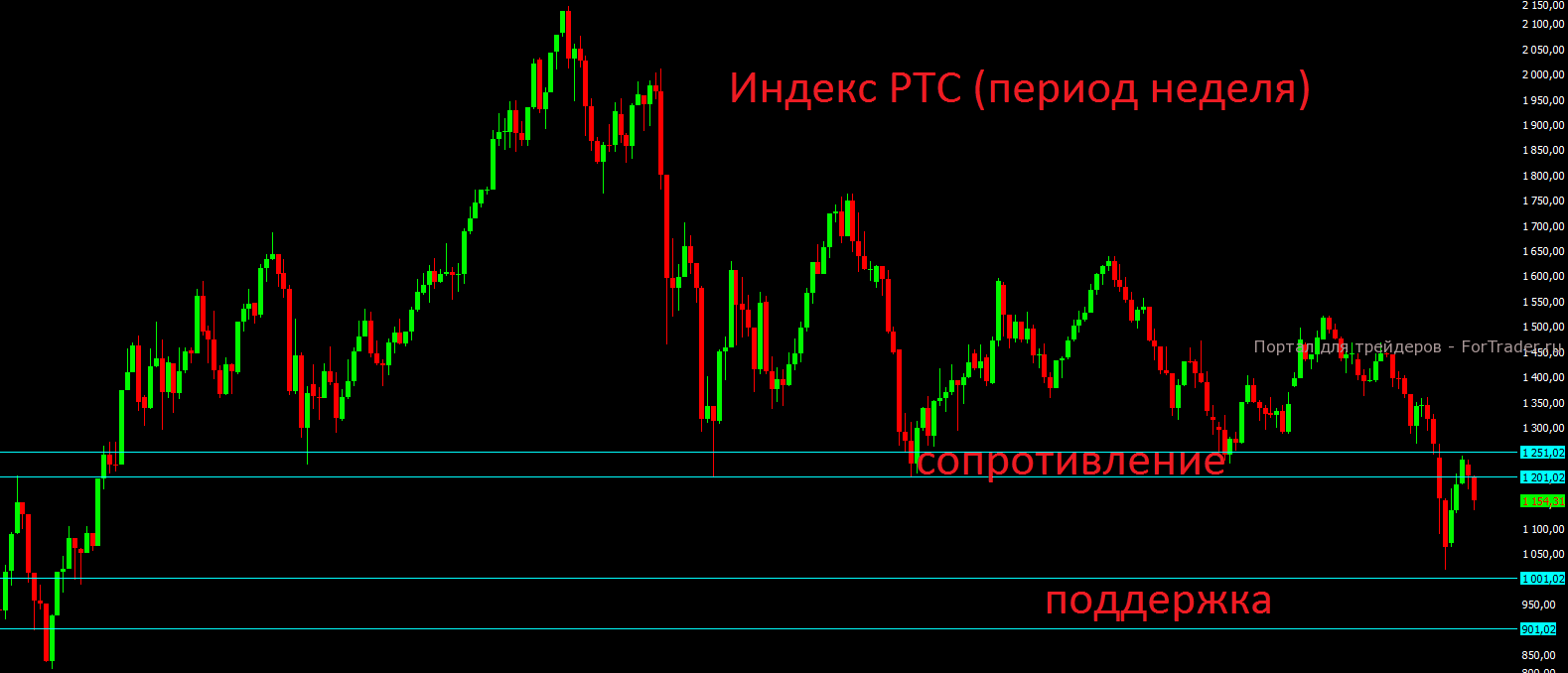 Если говорить про текущую ситуацию глядя на недельный график индекса РТС, то прекрасно видно, что ситуация пока больше говорит за снижение и если текущая неделя закроется в минусе, то шансы на дальнейшую коррекцию только увеличатся. Пока можно говорить, только о техническом локальном отскоке к предыдущему падению. Пока мы свой среднесрочный негативный взгляд на апрель и на май не пересматриваем. Только в случае закрепления индекса РТС выше отметки 1250 пунктов можно будет говорить о развороте, а пока цели коррекции в диапазоне 1000-900 ещё актуальны.