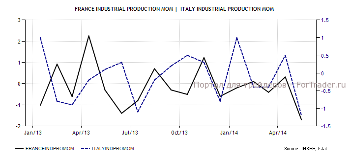 Евро упал после трех дней укрепления на фоне слабых данных по промпроизводству во Франции и Италии. Промпроизводство в мае резко упало во Франции на 1,7% м/м, в Италии — на 1,2% м/м, тогда как в обеих странах прогнозировался рост. Хуже ожиданий вышли и данные по инфляции во Франции. Годовые темпы роста инфляции в июне остались без изменений по сравнению с маем, +0,5%, против ожиданий роста на 0,7%. Представитель ЕЦБ Виско заявил, что рост в еврозоне всё еще очень слабый, и ЕЦБ готов к применению новых мер, включая покупку активов. Министр экономики Франции также высказался в пользу покупки активов со стороны ЕЦБ, назвав ее неизбежной.