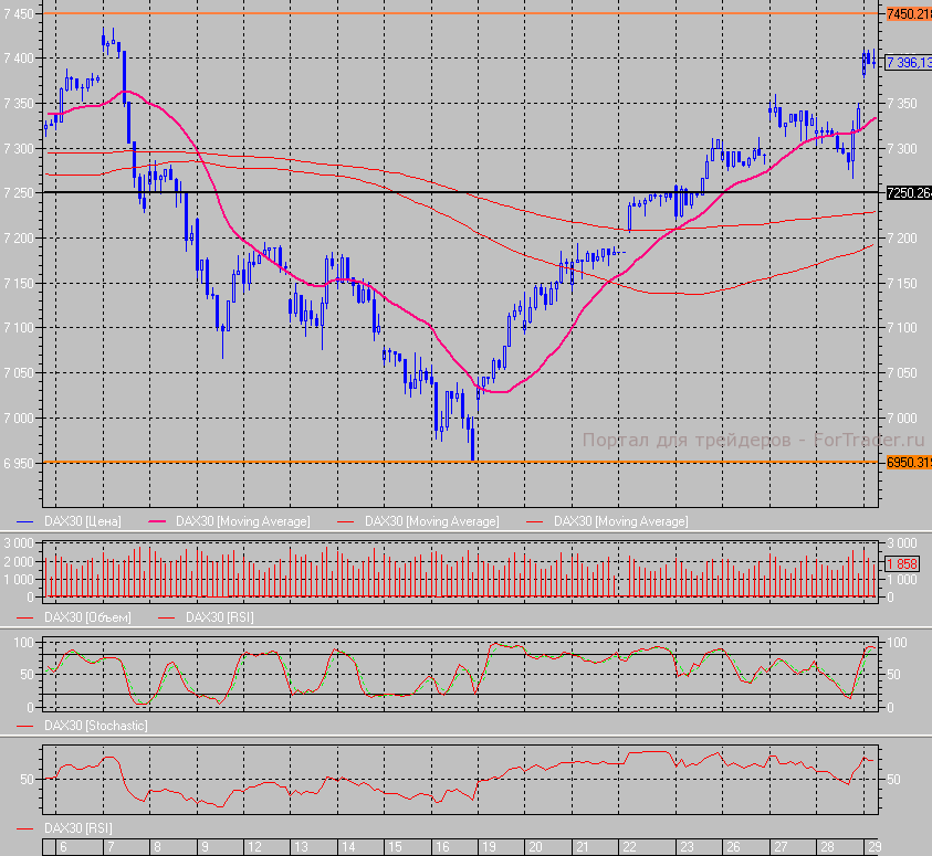 Индекс DAX утром стал довольно резко расти и с «гэпом» вверх достиг 7380 пунктов, пробил 7400 и протестировал 7410, однако не смог закрепиться выше этой отметки. Если во второй половине американцы не будут поддерживать оптимизм, то DAX может попытаться закрыть утренний разрыв.