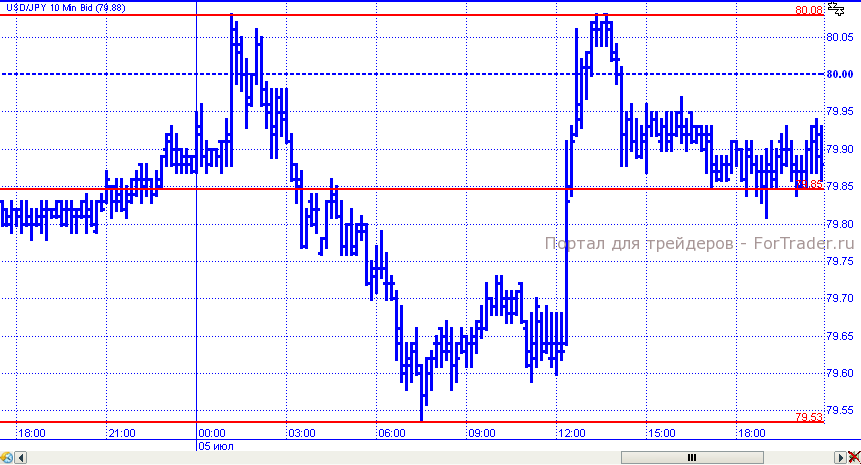 В четверг пара доллар/иена продемонстрировала разнонаправленные движения. В начале торговых суток цены поднялись к отметке 80,08, на которой отметили внутридневной максимум. Но довольно быстро скатились к уровню 79,53, от которого цены снова подскочили к верхней границе диапазона. К завершению дня пара откатилась в район уровня 79,85.