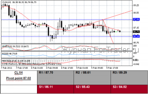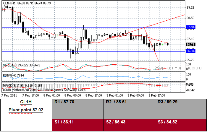 (Reuters) — Американские фьючерсы на сырье закрылись немного ниже в среду, после волатильной сессии, вызванной давлением правительственного отчета о запасах нефти, показывающем, что сырье и запасы продукта, повысились. В то время как данные Энергетической информационной администрации показали обуздание американского сырья, продолжающиеся опасения по поводу волнения в Египте, и более слабый доллар помог марке Brent подняться внутри дня выше 102$ за баррель. Премия Brent ее американскому коллеге CL-LCO1=R продвинулась к рекордно высокому уровню, выше 15$ за баррель. На Нью-Йоркской товарной бирже сырье для поставки в марте CLH1 упало на 23 цента, или 0.26 процента, чтобы рассчитаться за 86,71$ за баррель, торгуясь от 86,36$ до 87,95$. Председатель Федеральной Резервной системы Бен Бернанке предположил, что американские экономические условия все еще слишком слабы для центрального банка, чтобы вернуться к монетарным стимулам, несмотря на падение уровня безработицы.