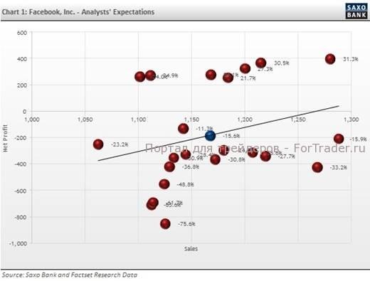 Такой разброс оценок подчеркивает то, насколько мало мы на самом деле знаем об этой акции и ее возможности приносить прибыль инвесторам. В среднем аналитики ожидают, что прибыль на акцию Facebook составит 12 центов при выручке в размере 1,16 млрд долларов США. Значительное расхождение во мнениях отчетливо просматривается на Графике 1, где маржа чистой прибыли варьируется от -75% до +31%.