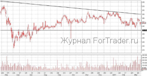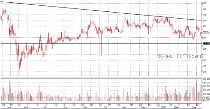 Рассмотрим акции МТС с позиции технического анализа. С апреля прошлого года котировки торгуются по линии предложения по Демарку, которая проходит на текущий момент в районе 260 р. Основной поддержкой для покупателей выступает уровень 240 р. Таким образом, сформировался нисходящий треугольник и для определения дальнейшего движения необходимо дождаться его реализации. Однако, в случае классической реализации и пробоя уровня поддержки на 240 р. котировки снизятся с целью на 215 р.