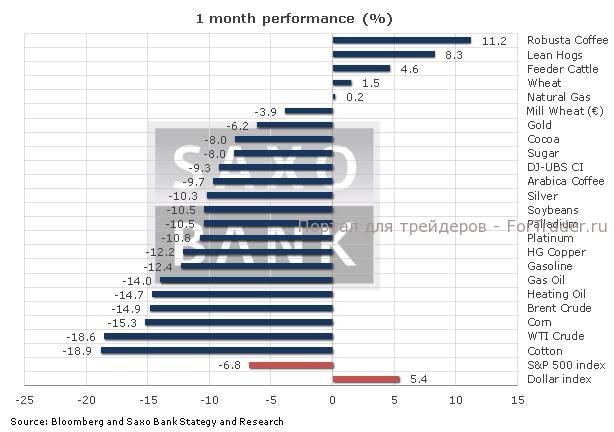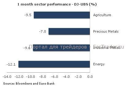 Все эти события заставили инвесторов увеличить покупки надежных государственных облигаций, в результате чего доходность по двухлетним немецким облигациям достигла отрицательных значений, а также валют-убежищ, таких как японская иена и, в особенности, доллар США, который установил 23-месячный максимум в паре с евро. Между тем, сырьевые рынки понесли одни из самых серьезных потерь с 2008 года. Широкий сырьевой индекс Dow Jones-UBS упал более чем на 9%, причем под горячую руку продавцов попали все отдельные сектора, как видно из приведенного ниже графика. Ориентированный на энергетический сектор индекс S&P GSCI показал свои худшие результаты по итогам месяца с 2008 года, потеряв почти 13%, так как оба сорта нефти – WTI и Brent – подешевели более чем на 20% по сравнению с максимальными значениями и технически вошли в стадию «медвежьего рынка».