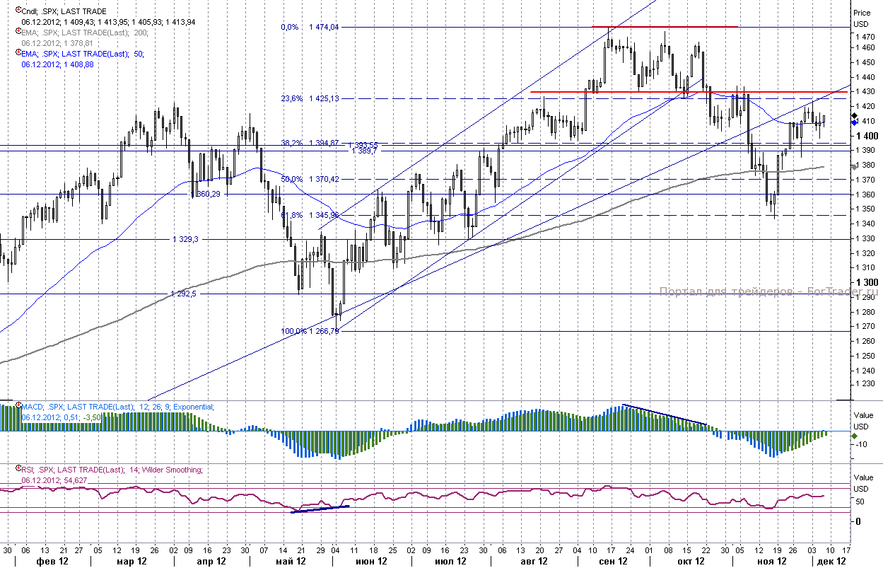 В то же время сохраняются опасения по поводу проблемы бюджетного обрыва в США, где Конгресс и Белый дом не могут договориться о размерах сокращения бюджетных расходов и повышении налогов. Не исключено, что эта история будет оказывать давление на рынок весь декабрь, если конечно компромисс не будет найден заранее. При отсутствии договоренности между Белым домом и Конгрессом могут возникнуть большие трудности в плане того, чтобы страна избежала нового периода рецессии. Б. Обама в среду пообещал заключить соглашение по данной проблеме в течение одной недели, если республиканцы согласятся на увеличение налогов для богатых.