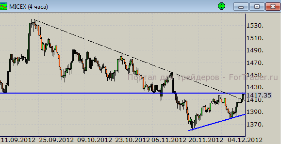 Сентябрьский нисходящий тренд сломлен. Цены уверенно пробили его линию предложения и устремились наверх. Однако, отметка 1420 пунктов сдержала покупательский порыв. Судя по внешнему фону открытие торгов пройдет в красной зоне и будет способствовать локальному снижению котировок. Бывший нисходящий тренд, а также отметка 1410 пунктов, теперь будут выступать на стороне покупателей. Преодоление индексом отметки 1420 пунктов откроет ему дорогу в район уровня 1450 пунктов.