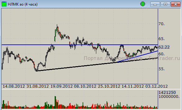 На данный момент котировки зажаты в сужающемся диапазоне торгов. Близится выход цен из данного диапазона. Пробой его вниз приведет к снижению цен в район линии спроса осеннего восходящего тренда, проходящего у отметки 58 рублей. Преодоление уровня 63 рубля позволит котировкам идти выше.
