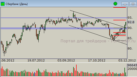 Цены вышли из нисходящего канала вверх. Кроме того, пробой отметки 90 рублей стал триггером к усилению роста. Таким образом, предыдущая нисходящая тенденция завершена. Технически напрашивается тест отметок 94-95 рублей, где проходят первый уровень расширения Фибоначчи, построенный на первой волне роста, а также горизонтальный уровень предложения. Отметки 91-90 рублей теперь выступают нижней границей диапазона 95-90 рублей.