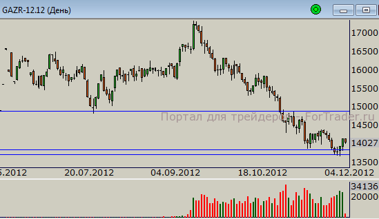 Пробив предыдущий минимум в текущем нисходящем движении — отметку 13900 пунктов, котировки были остановлены у уровня 13700. Три торговые сессии подряд цены консолидировались у этой отметки. При этом объем торгов на росте может говорить в пользу появления спроса на данных уровнях. Накануне цены вернули отметку 13900 пунктов на хорошем объеме торгов. Таким образом, сформировался плацдарм для движения цен север в рамках диапазона 13700-14900 пунктов.