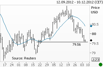 В среду утром на азиатских площадках преобладал рост, среди лидеров – китайские фондовые индексы, поддерживаемые заявлениями властей о стабилизации экономической активности Китая и надеждами на продолжение уверенного роста экономики. Тем не менее, широко обсуждаемый фискальный вопрос в США сдерживает оптимизм инвесторов на международных финансовых рынках. Сегодня доллар США продолжил падение по отношению к наиболее ликвидным валютам, за исключением, пожалуй, японской иены, а евро достиг семинедельного максимума – 1.3123. Индекс доллара опустился до самого низкого за последние шесть недель значения – 79.56 (см. график).