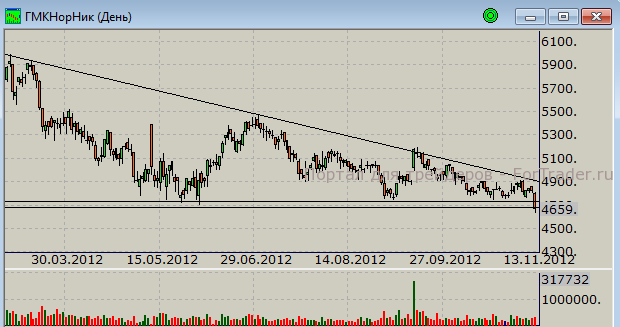 Очередной жертвой продаж вторника стали бумаги ГМК. Цены пробили годовой минимум и устремились вниз. С технической точки зрения цены вышли из сужающегося диапазона торгов, который на протяжении длительного времени их удерживал. Данное обстоятельство открывает потенциал дальнейшего снижения котировок.