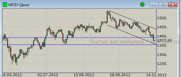Накануне цены пробили вниз очередной краткосрочный диапазон консолидации. Нижняя граница у отметки 1390 пунктов не справилась с натиском продавцов. Таким образом, индекс обновил минимум в текущем снижении и готов идти ниже. На данный момент существенная поддержка для покупателей располагается вблизи отметки 1450 пунктов. Она образована нижней границей нисходящего канала, а также горизонтальным уровнем спроса. Есть основания полагать, что преодолеть эти уровни с первой попытки индексу не удастся.