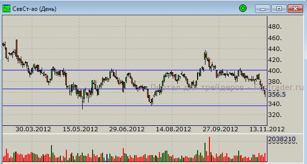 Котировки преодолели горизонтальный уровень спроса — отметку 366 рублей. В результате чего цены перешли в новый диапазон движения с границами 366-340 рублей. Целью текущего снижения выступает отметка 340 рублей, где покупателям будет оказываться поддержка, усиленная проходящим здесь же диагональным уровнем спроса на недельном графике.