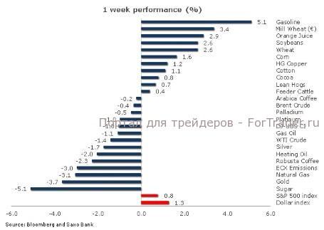 Индекс DJ-UBS за неделю потерял 1%, так как рост цен на многие сельскохозяйственные товары и удорожание цен на бензин были нивелированы коррекцией среди некоторых значимых для индекса компонентов, в частности на рынке нефти и золота. После того как ЕЦБ выделил 530 млрд евро, курс доллара вырос, так как участники рынка полагают, что это был последний щедрый дар со стороны Центробанка.