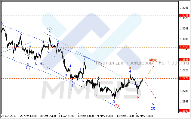 По мнению технических аналитиков, характер движения пары указывает на завершение нисходящего импульса «(с)» волны «В» старшего порядка. Таким образом, в качестве основного сценария понедельника можно рассматривать вариант дальнейшего укрепления курса единой валюты в направлении уровня 1.2910, где завершится волна «3» восходящего импульса старшего порядка. В то же время нельзя исключать и альтернативный сценарий, согласно которому нисходящий импульс еще не завершен. В этом случае пара может возобновить снижение к отметке 1.2610 в рамках усложненной структуры волны «Alt: (с)».