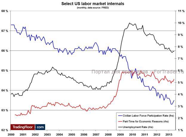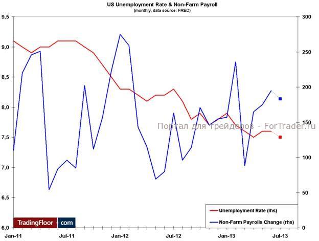 Занятость вне сельскохозяйственного сектора в июле предположительно выросла на 183 000 рабочих мест по сравнению с приростом на 195 000 в июне. Уровень безработицы должен немного понизиться с июньского показателя 7,6% до 7,5%. В свете достойных результатов индекса потребительского доверия и производственного индекса ISM за июль ожидания складывались в пользу высокого значения.
